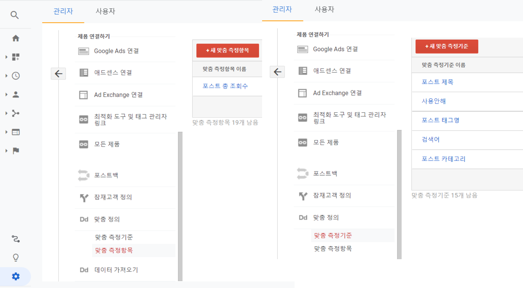 사용자가 필요에 의해 만드는 Custom Dimension(맞춤 측정기준), Custom Metric(맞춤 측정항목)이 있을 것이다.