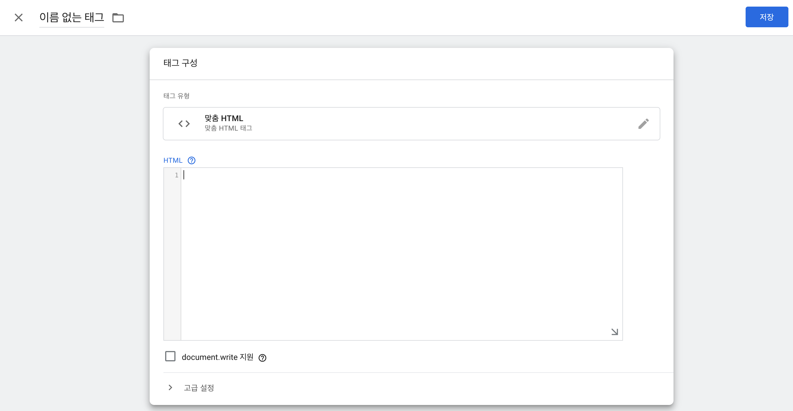 해당 이미지는 GTM의 맞춤 HTML 태그 화면이다.