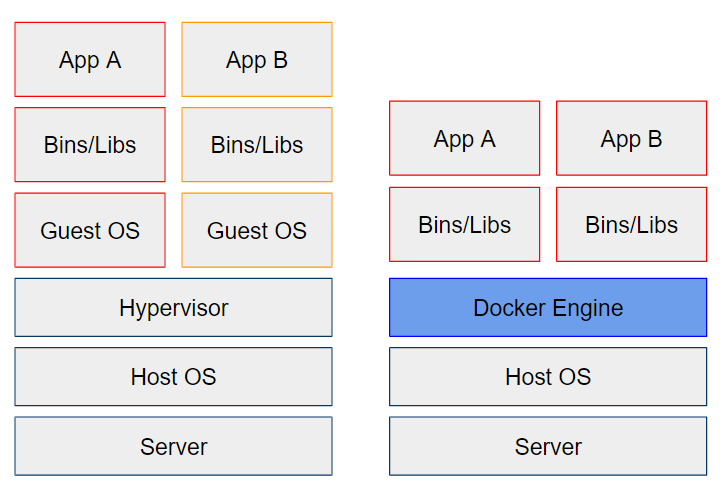 이처럼 도커 엔진을 활용한 컨테이너는 가상머신처럼 하드웨어를 전부 구현하지 않기 때문에 빠른 실행이 가능하다.