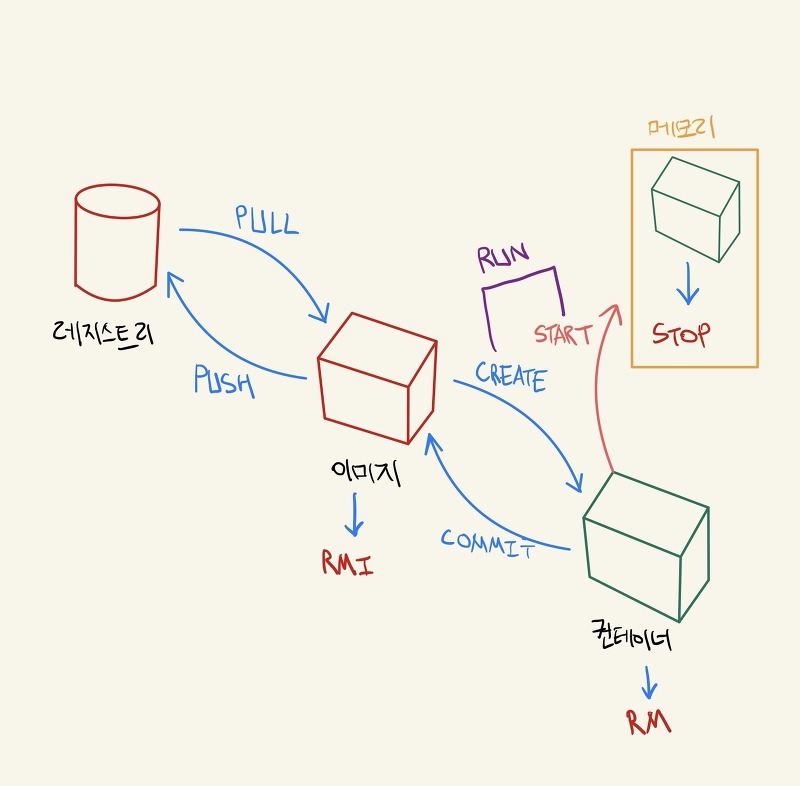 - 컨테이너 : 이미지를 격리하여 독립된 공간에서 실행한 가상 환경