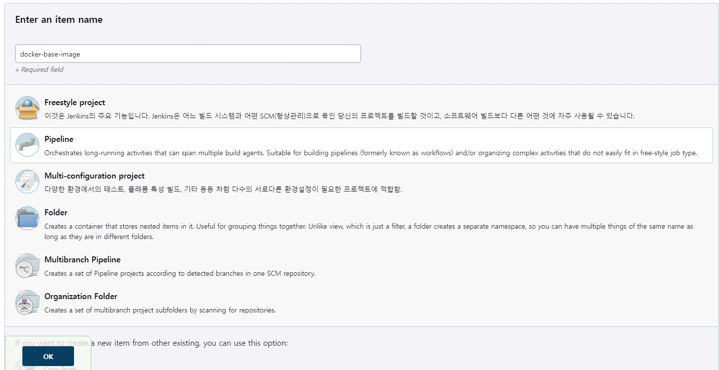 pipeline 으로 도커 베이스 이미지를 컨트롤 할 item을 생성한다.