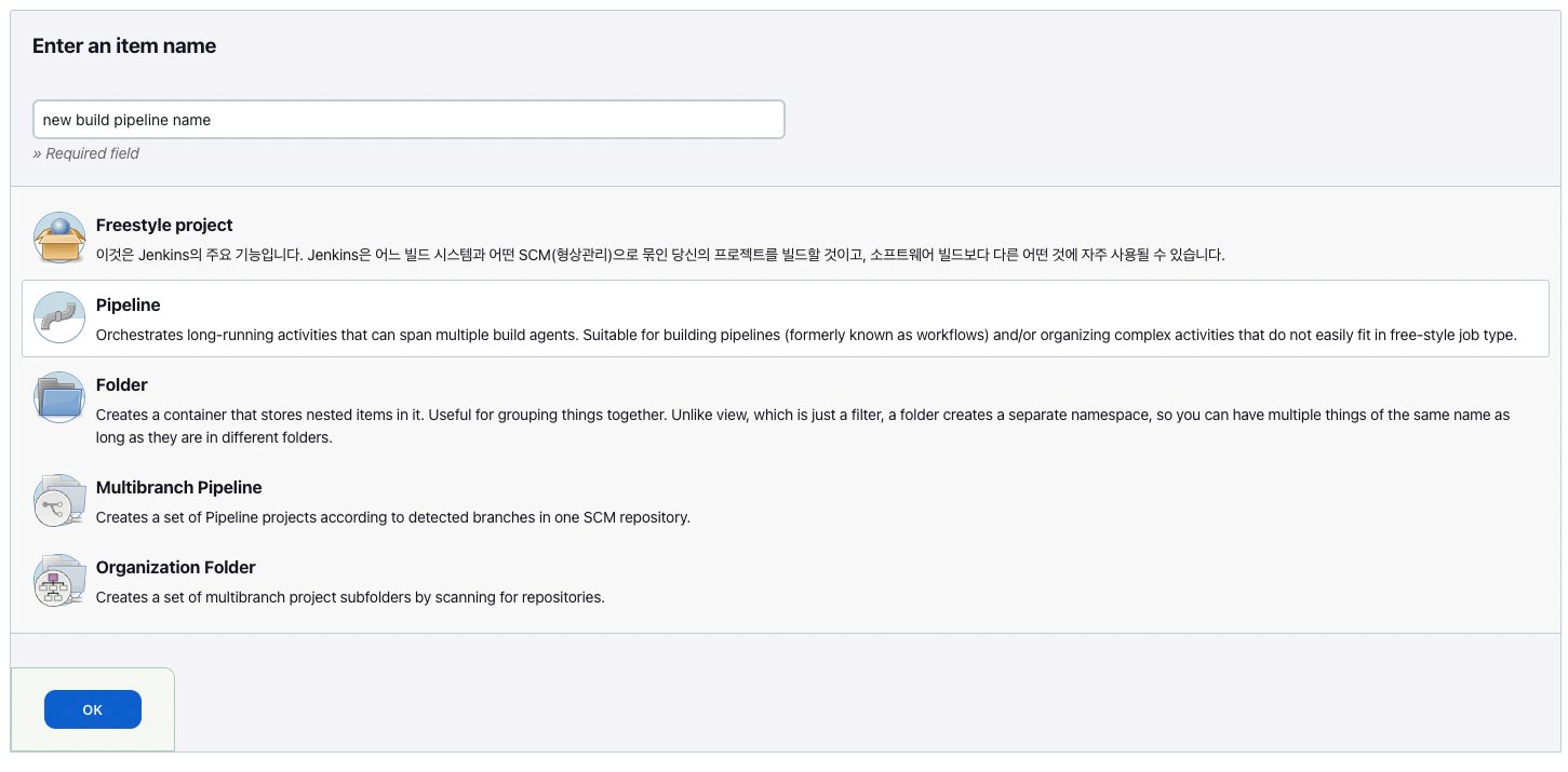 위 이미지는 Jenkins에서 CI/CD 환경 구축을 위해 "+ 새로운 item" 버튼을 누르면 나타나는 화면이다. (버전에 따라 조금 다를 수도 있다)