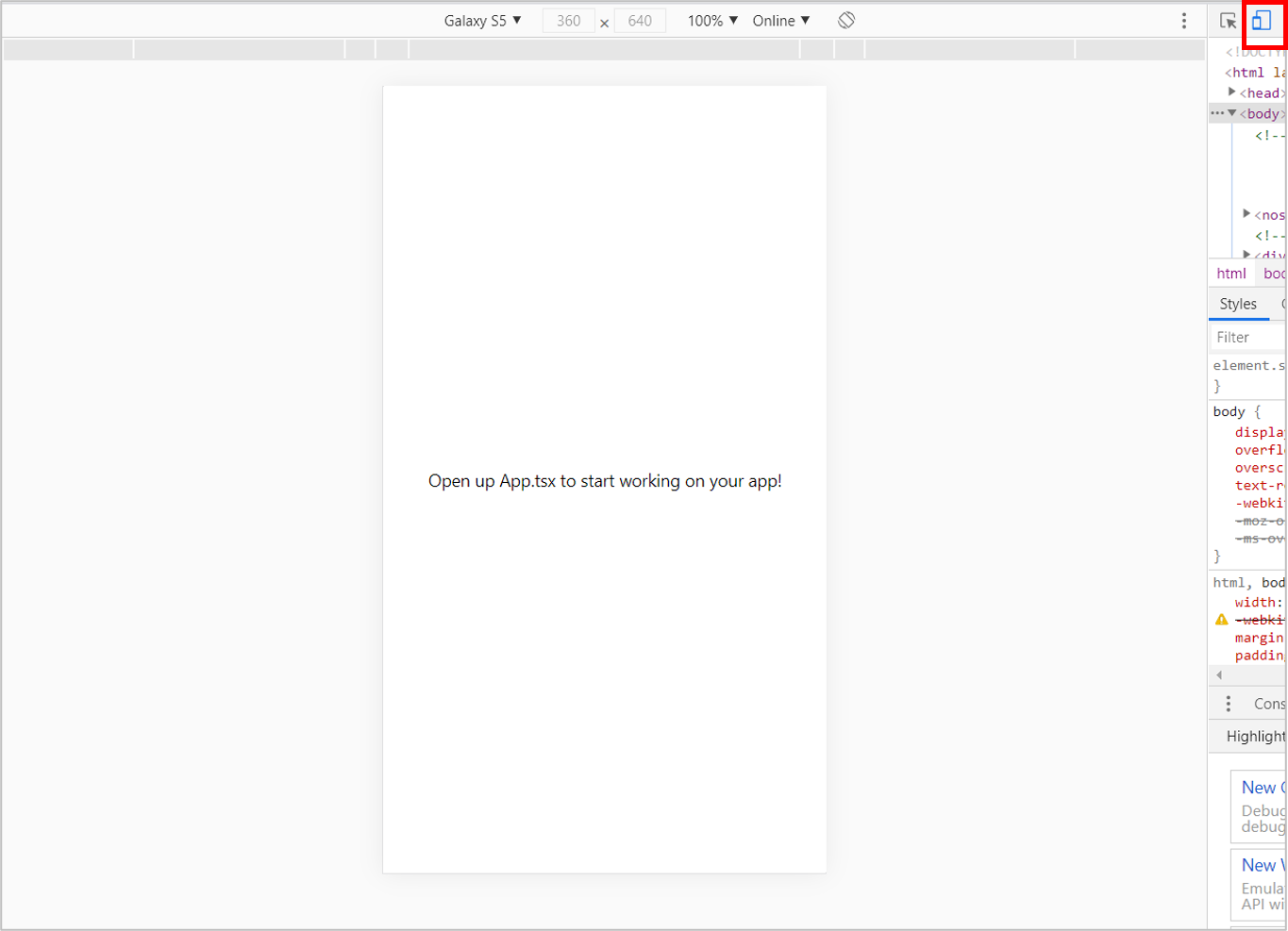 브라우저에서 개발자 모드 F12를 누르면 빨간색 부분처럼 버튼이 보일 것이다. 이것을 누르면